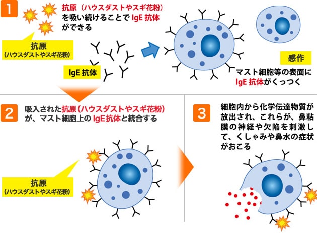 ある物質を私たちが鼻から吸い込むと、まず、異物なら何でも取り込む細胞「マクロファージ」がその物質に取り付き、その情報を「リンパ球」に伝えます。 そして、リンパ球がその物質をアレルゲンと認識すると、その物質が次に体内に入った時には、すぐに異物と認識して攻撃を開始して排除するための目印「抗体(IgE)」を作ります。抗体は、血液や粘膜内にある「マスト細胞(肥満細胞※)」にくっつきます。